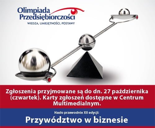 • W Centrum Multimedialnym dostępne są karty zgłoszeń do tegorocznej edycji Olimpiady z Przedsiębiorczości. Zgłoszenia przyjmowane są do dn. 27 października. W tym roku hasłem przewodnim Olimpiady jest "Przywództwo w biznesie". Pierwszy etap (etap szkolny) odbędzie się już 1 grudnia br.