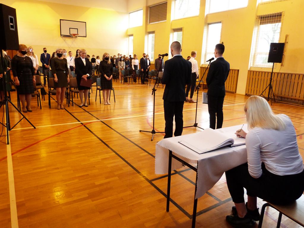 Po złożeniu aktu ślubowania głos zabrała Pani Dyrektor Dorota Bułgajewska - Muzyka, która skierowała do uczniów wiele ciepłych i ważnych słów. Odnosząc się do zdania wypowiedzianego przez Papieża Franciszka podczas Światowych Dni Młodzieży nie przyszliśmy na świat, aby "wegetować"…, przyszliśmy z innego powodu, aby zostawić trwały ślad Pani Dyrektor życzyła uczniom, aby w naszej szkole znaleźli sposób na pozostawienie śladu po sobie oraz podejmowali w życiu same trafne i dojrzałe decyzje.