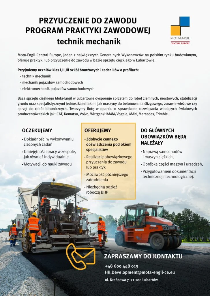 Mota-Engil Central Europe S.A. zaprasza na praktyki w roku szkolnym 2022/2023 w zawodzie technik mechanik