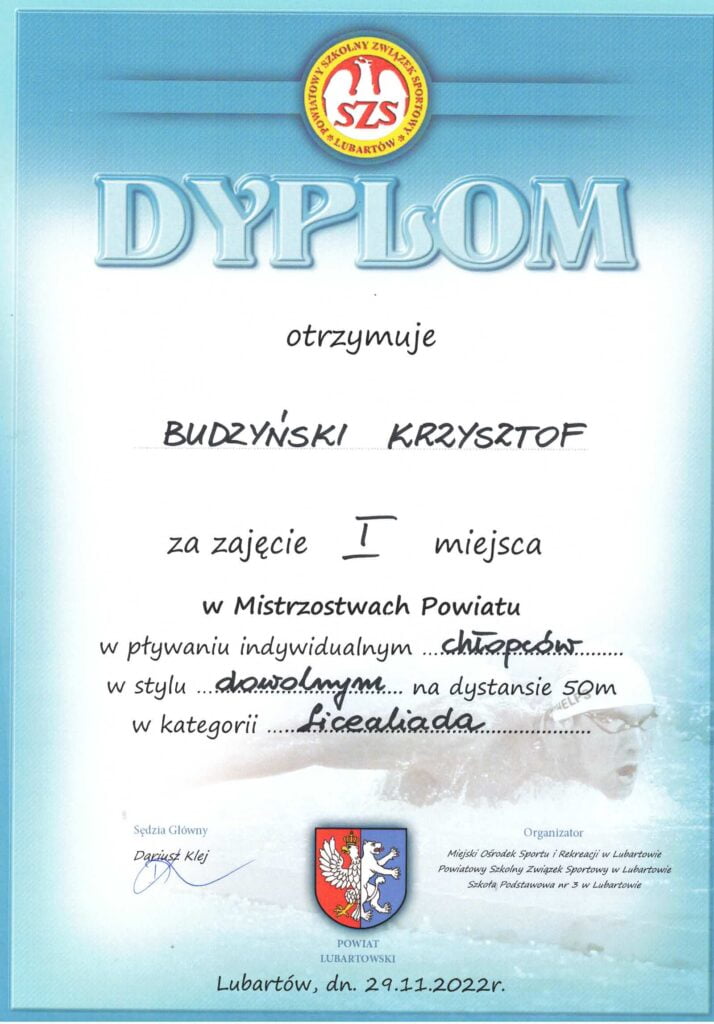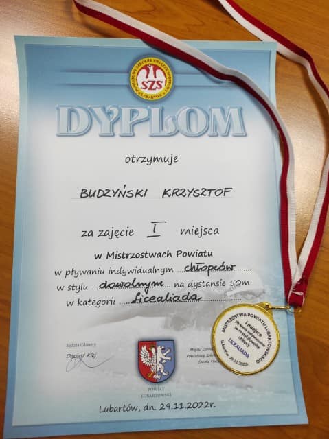 Uczeń Regionalnego Centrum Edukacji Zawodowej w Lubartowie, Krzysztof Budzyński, wywalczył złoty medal w Powiatowych Mistrzostwach w pływaniu, które odbyły się 29 listopada na pływalni MOSiR w Lubartowie. Krzysztof przepłynął dystans 50 m w czasie 29,00 s i całkowicie zdeklasował rywali z innych lubartowskich szkół ponadpodstawowych, m.in. Zespołu Szkół nr 2 i II Liceum Ogólnokształcącego. Dodatkowo ustanowił nowy rekord szkoły.