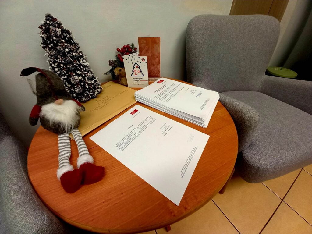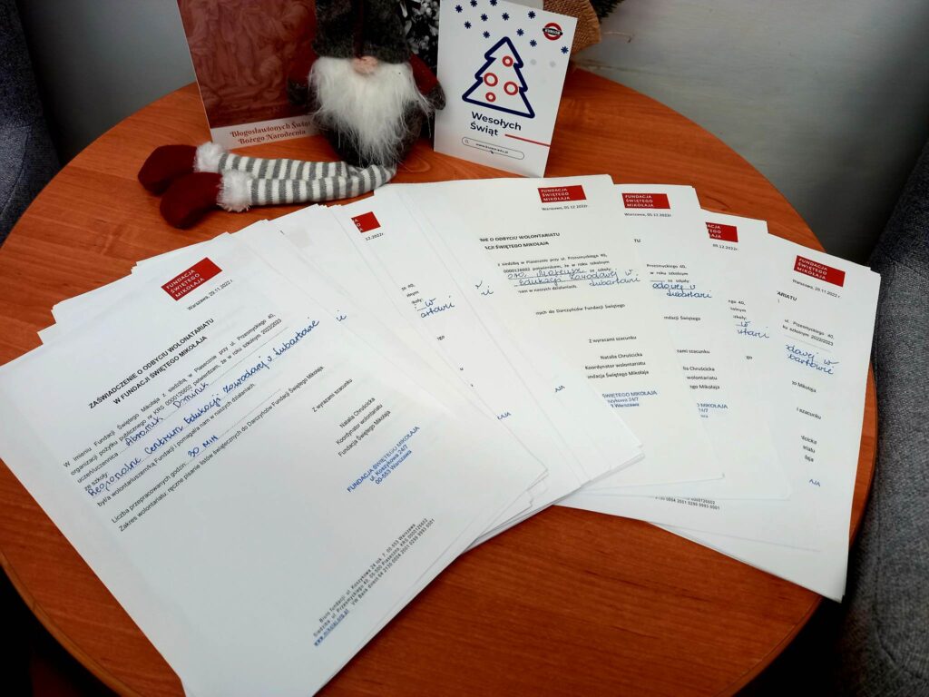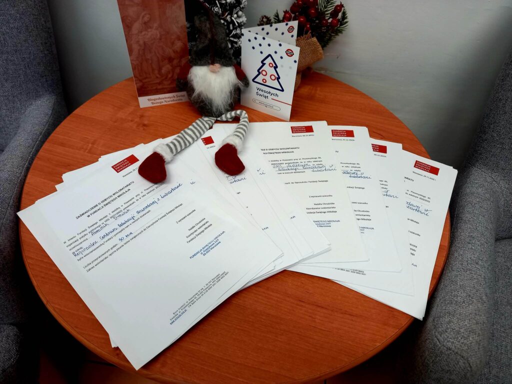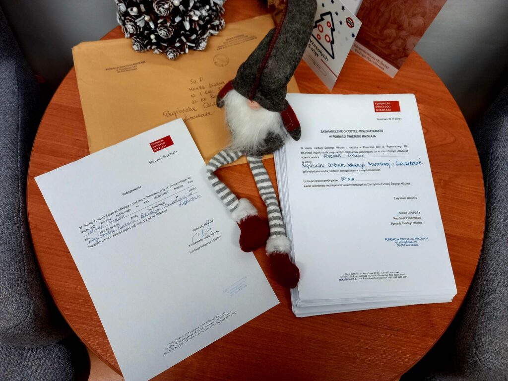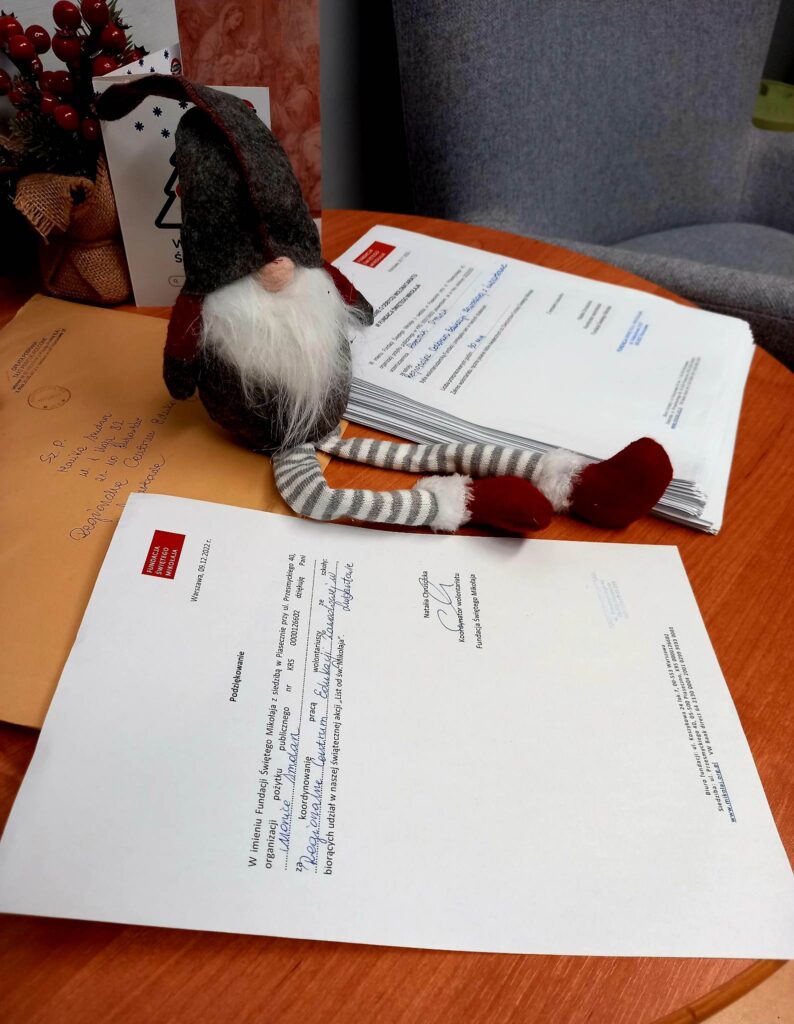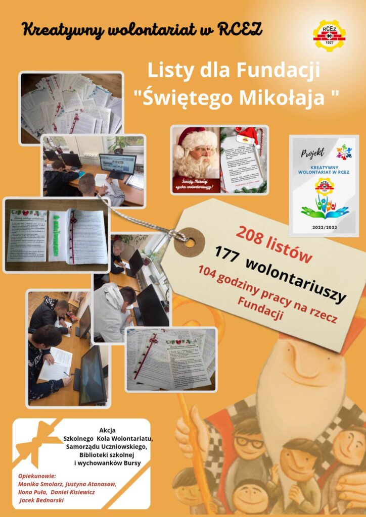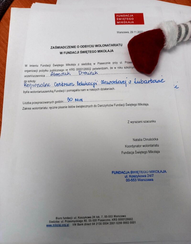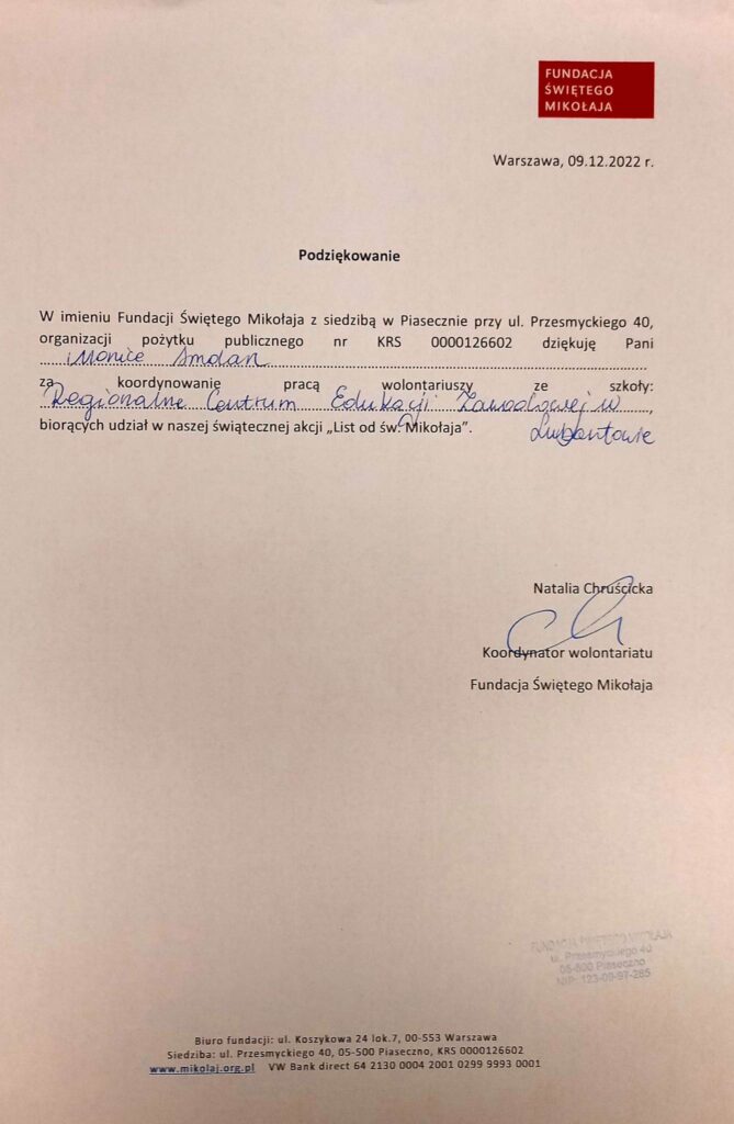 Szkolne Koło Wolontariatu, Samorząd Uczniowski, Biblioteka szkolna oraz wychowankowie Bursy wzięli udział w akcji pisania listów do Św. Mikołaja, którego organizatorem jest Fundacja Świętego Mikołaja. Tradycja ręcznie pisanych listów umiera? Na pewno nie u Świętego Mikołaja! Znając dobre serca naszych uczniów oraz chęć niesienia bezinteresownej pomocy - wiedzieliśmy, że ta akcja jest dla nas. Zgłosiliśmy naszą szkołę do zdalnego wolontariatu, aby w okresie przedświątecznym wesprzeć Fundację "Świętego Mikołaja". Fundacja ta wspiera zdolne dzieci z niezamożnych rodzin z różnych zakątków Polski w rozwijaniu swoich talentów (przekazując dzieciom Stypendia Świętego Mikołaja) oraz wspiera biedne dzieci z Aleppo (w Syrii) oraz Mariupolu (na Ukrainie). Każdego roku w grudniu każdemu z darczyńców Fundacja wysyła listowne podziękowania. W pisaniu świątecznych listów wspierają ją wolontariusze. Naszym zadaniem było ręczne napisanie 208 listów z podziękowaniami do Darczyńców Fundacji. Jest nam niezmiernie miło przekazać, że w akcję zaangażowało się aż 177 uczniów, którzy łącznie przepracowali na rzecz Fundacji 104 godziny. Każdy z nich otrzymał zaświadczenie o odbyciu wolontariatu wraz z liczbą przepracowanych godzin.