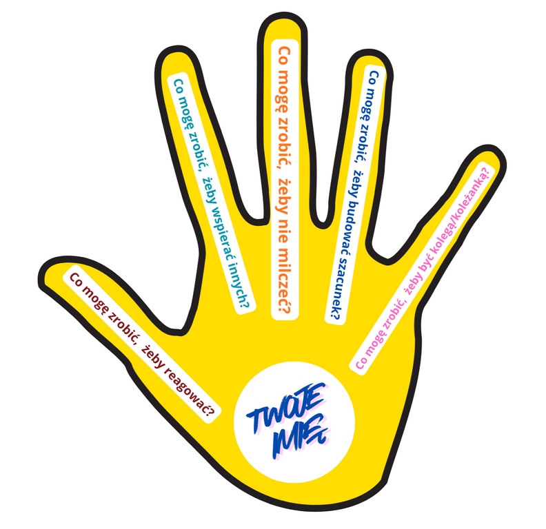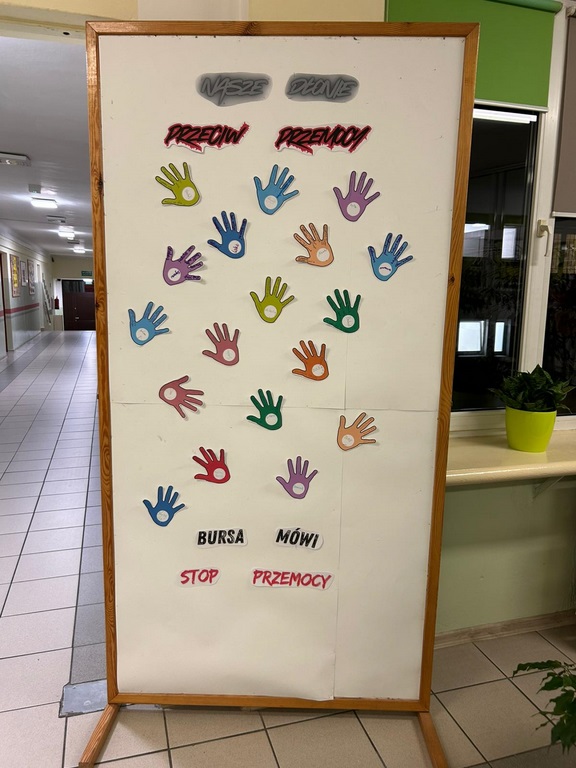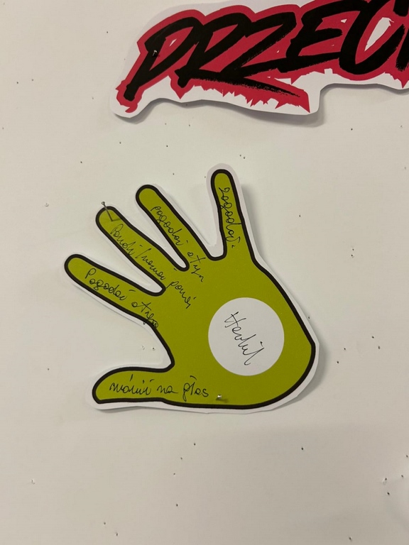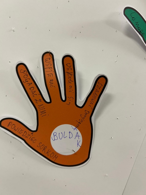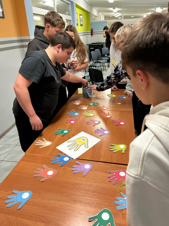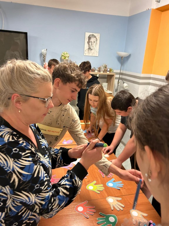 Grupa I przygotowała warsztat „Moje dłonie przeciwko przemocy”. Na kolorowych dłoniach młodzież odpowiadała na pytania: