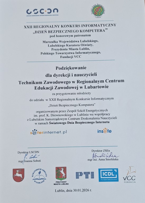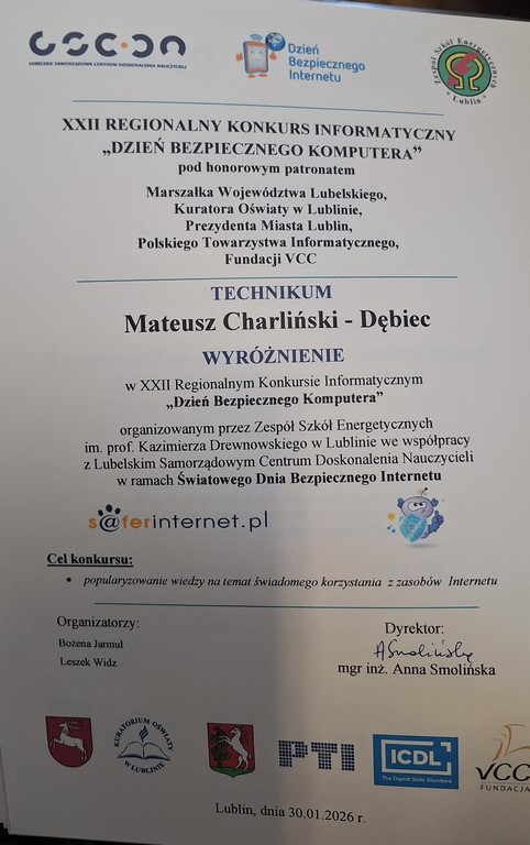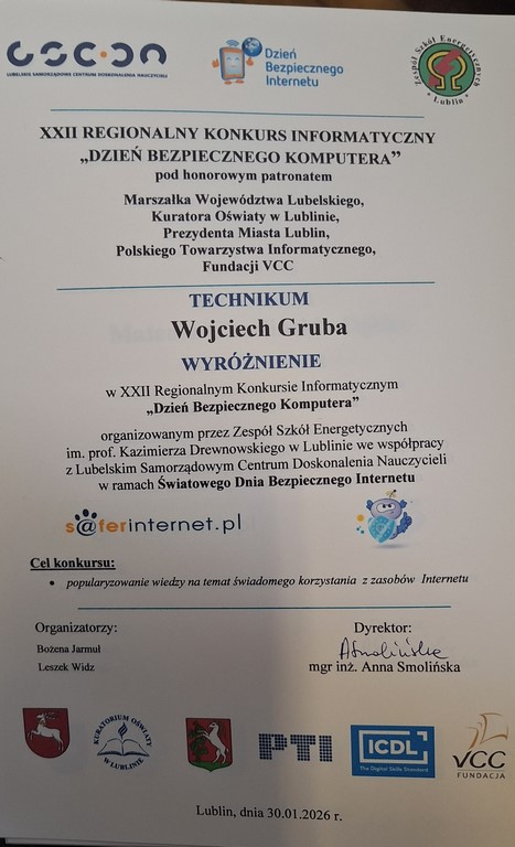 Uczniowie klasy 2TMe - Mateusz Charliński-Dębiec i Wojciech Gruba otrzymali wyróżnienia w etapie regionalnym XXII Regionalnego Konkursu Informatycznego „Dzień Bezpiecznego Komputera”.